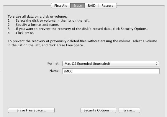 如何將SSD與Mac連接呢?硬碟插槽(Hard Drive Dock)是很容易找到的,雖然大多數僅為USB3。如果你的Mac沒有USB3,你可以考慮FireWire插槽,或eSATA插槽,如果在你的Mac Pro有eSATA卡。目前比較難找到Thunderbolt插槽,但你可以使用Seagate BackupPlus(名為GoFlex)Thunderbolt連接器,連接大部分的SSD裸碟。一旦可以連接了,你就可以使用Disk Utility(磁碟工具),輕鬆愉快的清除硬碟。完成之後,卸載(Unmount)、退出(Eject)、然後將SSD插入攝影機中。