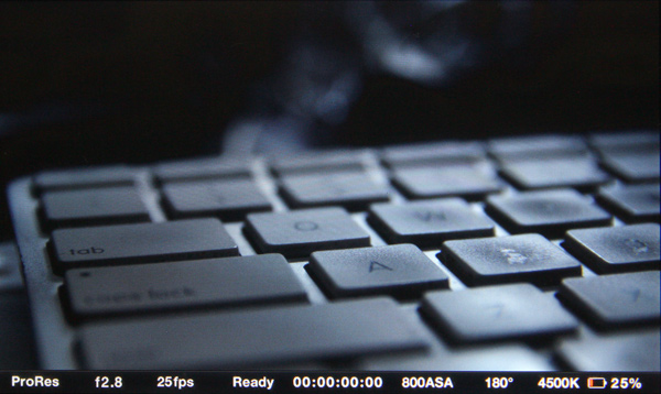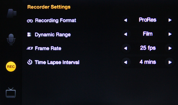 為了在後期有更大的彈性,將Recorder Settings(錄影設定)的Dynamic Range設定成Film,而Display Settings(顯示設定)的Dynamic Range則設定成Video。這樣一來,你將看到比較“正常”的畫面,但你所錄製的則是寬範圍的動態範圍,可以在後期做更好的處理。為了有比較容易的工作流程,大部分時候我保留ProRes的設定。