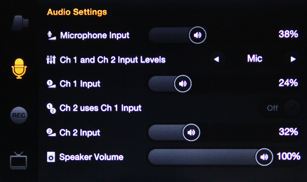 如果你要外接的麥可風(你應該要有),拿出你的轉接頭:你需要將不管你有的是什麼,轉成一對平衡的1/4吋接頭,你家附近的音樂相關產品販賣店,也許就有一些方便的纜線。通常,外接的前置擴大機(Preamp)可以讓噪音降到最低,但你也可以直接將聲音錄進攝影機,而得到不錯的效果。插上你的耳機,進行聲音的監聽,但請注意,並沒有可見的音訊量計(Audio Meters,目前沒有)。注意!如果你沒有使用前置擴大機,要將音訊水平(Audio Level)設定成比較低(約30%左右)。
