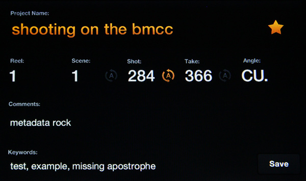 在你拍攝之前,點擊一下螢幕,然後輸入一些簡要的資訊。在最後,設定Scene/Shot/Take編號,然後選擇項目右側的“Auto(自動)”選項,讓編號自動增加,如果是連續劇,可能設定在“Take”,如果是比較不那麼正式的拍攝,可能設定在 “Shot”。