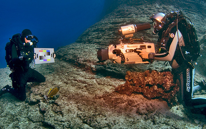 我們是如何辦到的呢?其實很簡單,不論是水上或水下的拍攝,幾乎在每一個場景拍攝,我們都一定使用ChromaDuMonde圖卡,圖卡提供我們非常準確的100 IRE(全白)。IRE與色彩飽和(Color Saturation)直接相關,IRE的值越高、色彩飽和度越真實。如果您考慮其他白平衡的來源,您會為使用便宜貨付出代價,相較於獨特的ChromaDuMonde圖卡,大部分的便宜貨所測量出的IRE值通常約為88到89。即使您用RAW拍攝,我建議您使用此圖卡獲得精確的拍攝。我們甚至將圖卡帶到水下以確保在水中我們有正確的色彩平衡。較小的圖卡在潛水時比較容易攜帶,但它所提供的準確度不亞於大塊的圖卡。在全世界許多電影節的演講時,我總是建議要使用這些圖卡以便精準的進行拍攝。