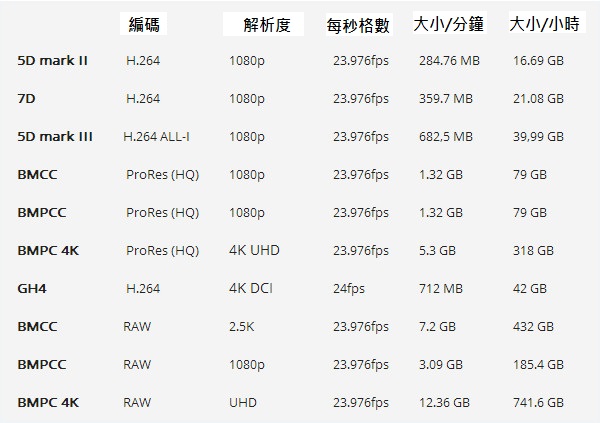 下面的表格,您可看到根據上面的案例,得到的估計所需硬碟空間,其中還包含了使用BMCC、BMPC、及BMPC 4K以RAW檔進行拍攝的選擇: