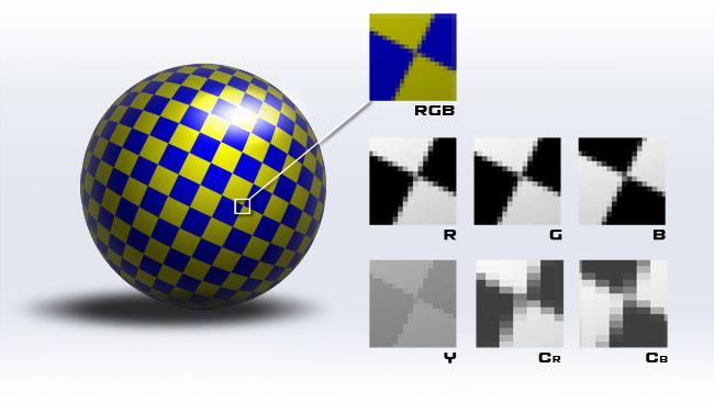 關於色彩精確度還有另一個優勢,從純應用的角度來看,許多8-Bit的影像以另一種所謂的YUV資料空間來表示,其中Y通道代表黑白影像、U及V頻道則分別代表RGB通道紅和藍色之間的差分量。這個的好處是,也許有些人還不知道,人類的眼睛對於亮度部分較為敏感,對於色彩比較遲鈍。利用這種特性將4:4:4取樣降低為4:2:2、4:1:1、4:2:0等取樣,進行影像的儲存,其中所做的是U及V通道解析度的降低、所牽扯的技術就是二次取樣(Subsampling)。高階的廣播格式通常使用4:2:2取樣,其U及V通道相較於Y,只儲存一半水平解析度,在影像品質沒有明顯變差的情況下,節省了1/3的影像儲存空間,降低了所需儲存空間的需求。