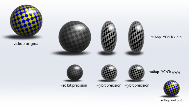 這個方法對於在後製不會進行大量處理的素材,不論是在錄製或輸出都很好用。但事實上,壓縮比較低,對於許多應用程式來說,比較好的處理。當進行非常吃重的調光、或運用去背(Chromakey)的技術時,壓縮比高就容易產生問題,因為這些都不是靠人眼進行影像的處理,設備可以察覺非常細微的色彩資訊。然而,將4K或QHD影像降轉成HD,在無需二次取樣的情況下,可清楚的產生U及V通道,允許更完整的轉換成無二次取樣(Un-Subsampled)的結果 – 或許是具有相同色彩與亮度解析度的RGB影像。要注意的是:YUV與RGB資料的轉換,本質上會有些微的損耗,因為有些色彩並非兩者都可以顯示(編按:RGB > YUV),想同時求得無二次取樣優點與10-Bit精確度的優點,在數學上是困難的;對於亮度及色彩資訊的各有其優點。但同樣的,實際上至少還是有其優點。