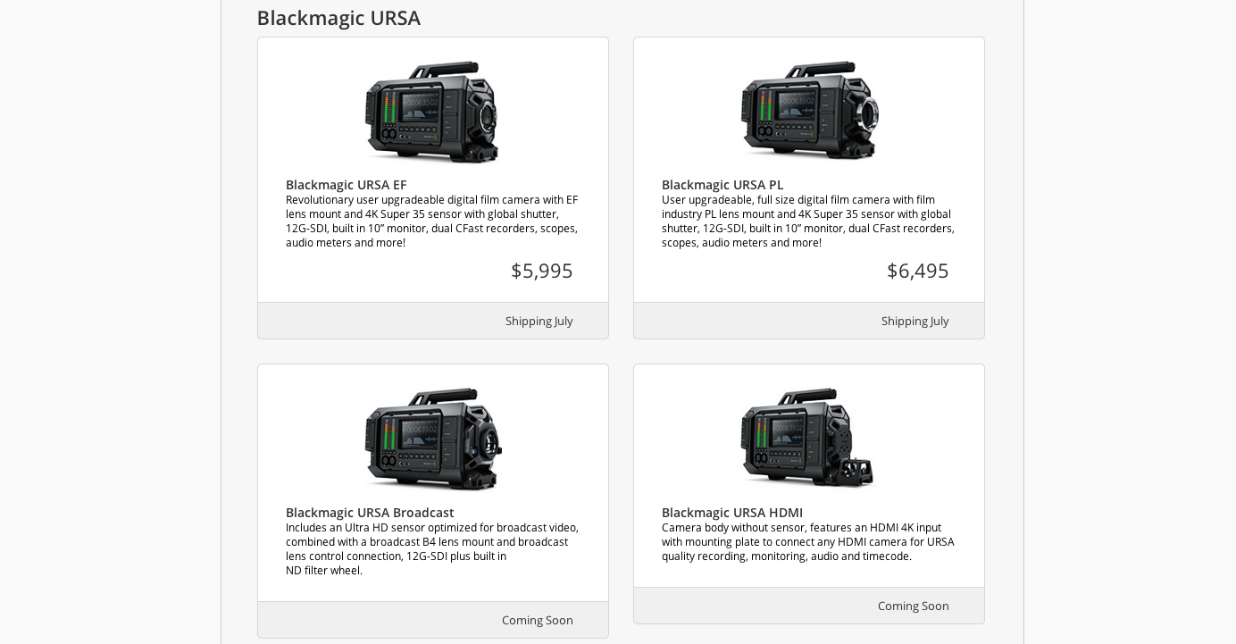 這並不意味他們現在已經可以大量出貨,但攝影機放在完整的產品包裝盒裡,至少表示它們已經距離交期不遠了,搞不好已經有經銷商拿到少量的攝影機了。如果您還記得,原本Blackmagic宣布的交期是七月,但這樣的說法在技術上來說,指的是攝影機離開他們工廠的時間是七月。對於URSA出貨的日期,在他們的官網上目前仍維持原來的時間: