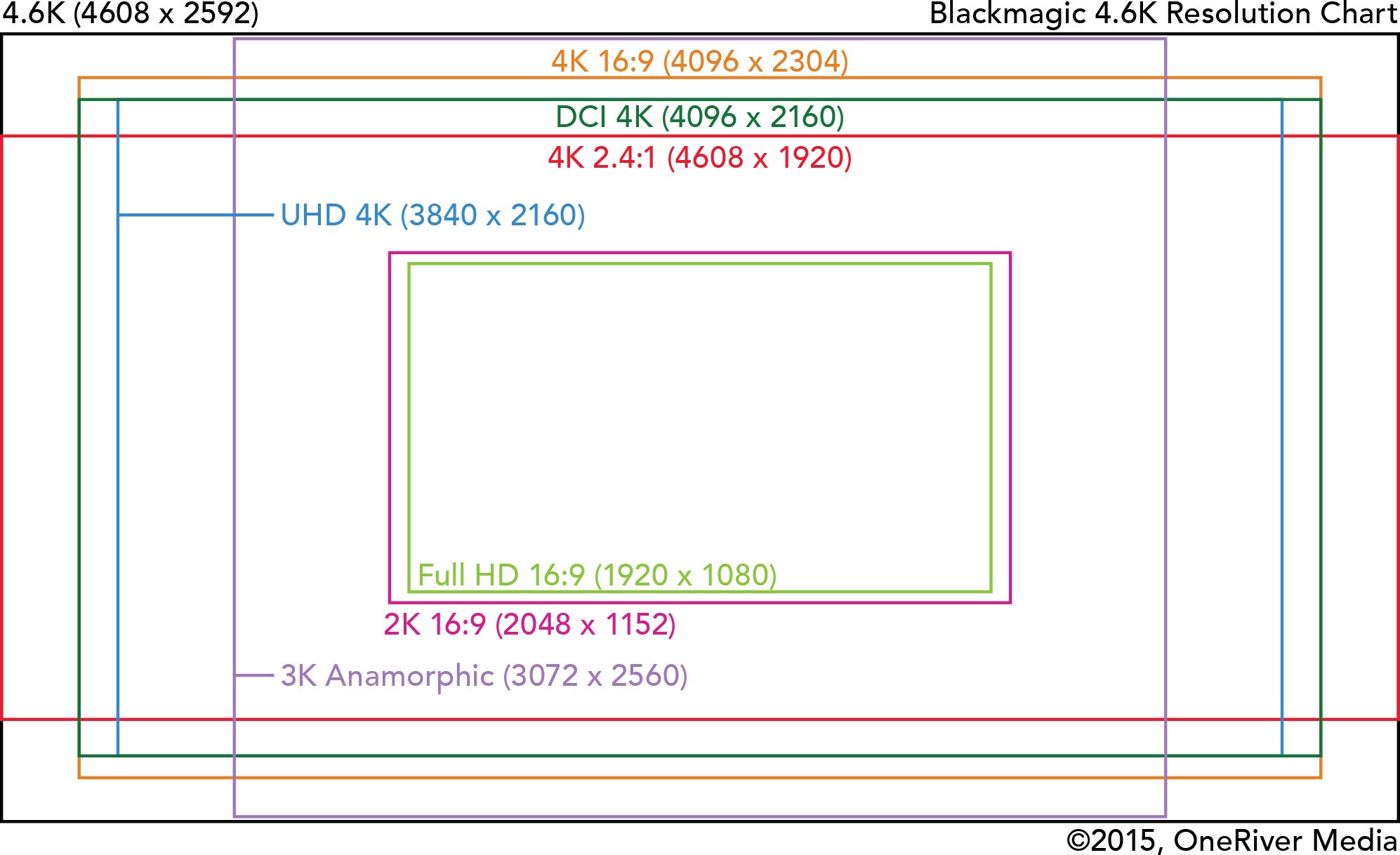 4.6K感光元件提供的解析度很不錯。正如在文章開始時提到的,最高的錄製解析度為4608×2592,這比DCI 4096×2160的數位電影規格還要大。這是一項真的很棒的特性,因為它讓你能選擇透過縮放、或視窗裁切的方式,來實現DCI 4K(或者UHD 4K、1080 HD等等)。所有能用4.6K感光元件錄影的解析度如下:
