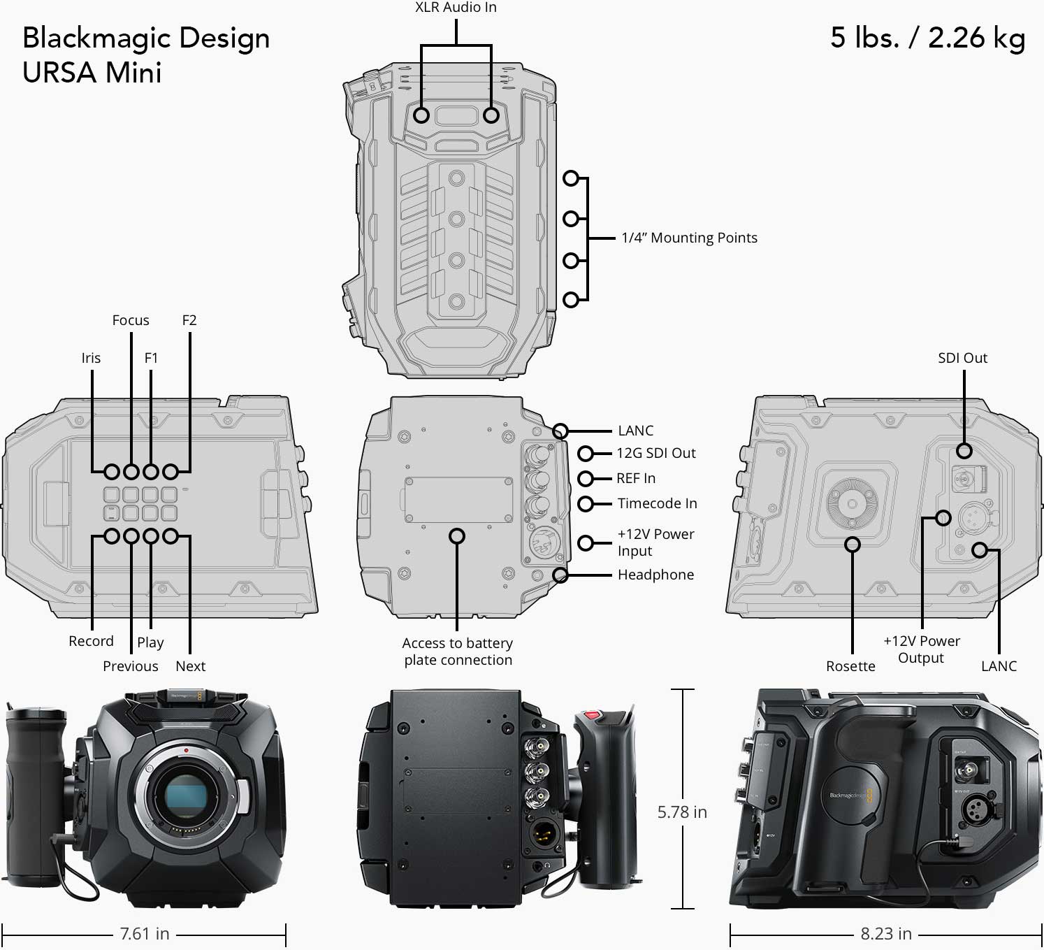 URSA Mini的機身構造得很好。主要的材料是鎂合金,兼顧強度和輕便,這方面比鋁合金還好。因此,最後得到的是2.26公斤(5磅)的機身(包括攝影機附帶的側握把),這和業界的其他攝影機保持一致。充足的1/4吋螺孔遍佈機身,可用於添加配件。