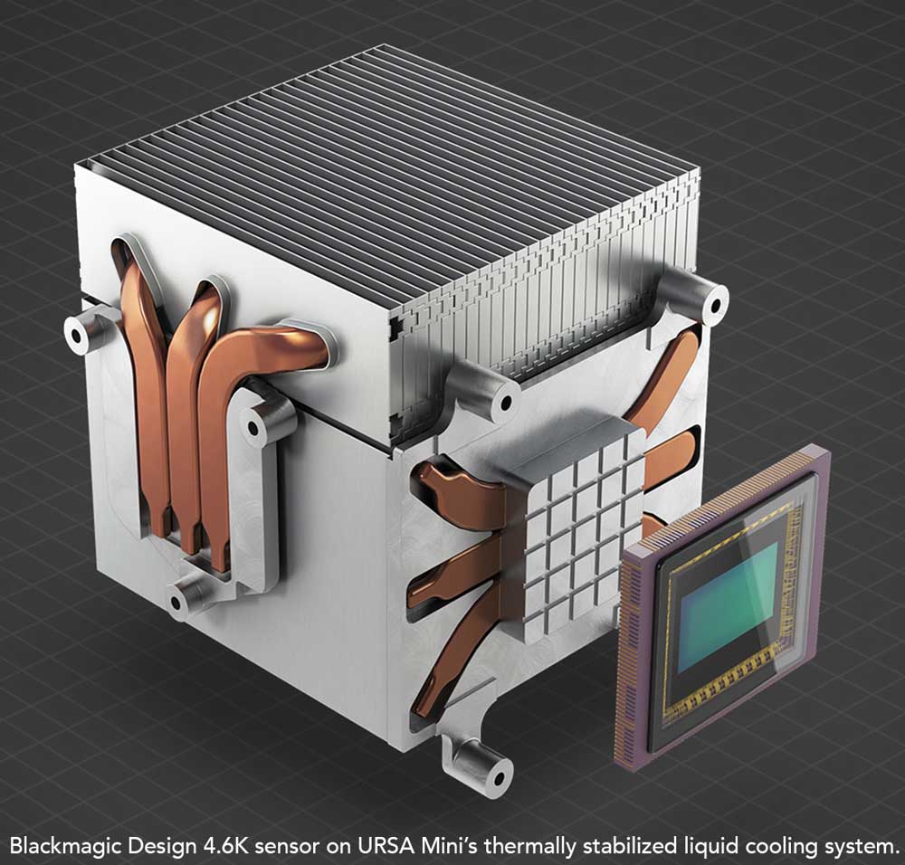 URSA Mini內部降溫,一個URSA所使用的液冷系統縮小版,置入URSA Mini中。因為新的4.6K感光元件有這麼高的品質,所以它必須有一個穩定的運作溫度維持其15檔動態範圍,且保證最少的雜訊,而這個液冷系統有助於保證溫度的穩定性。