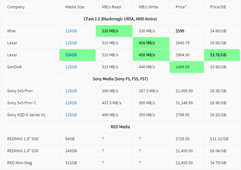 讓我感到驚訝的是,CF2的價格引起了這麼多的關注,而事實上Sony及RED的卡更貴,這在我上篇文章《解讀Blackmagic URSA》中提到過,裡面還有一個CFast 2.0與其他卡的詳細價格對比。我就把這個表再貼到這兒吧: