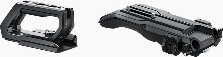 下面先來說明Blackmagic Shoulder Mount Kit(肩架套件),它添加了一個設計不錯的頂部提手和一個肩架,還有15mm標準圓桿接環、ARRI盤花形座、及標準的廣播級V-lock雲台快拆底板(幾十年來我個人的最愛)。加一個395美金的套件,將會大大增加URSA Mini的可用性和功能性。我可以說使用這個套件時,攝影機的平衡感覺和表現都很好…我將它視為Mini的“必備”配件強烈推薦。