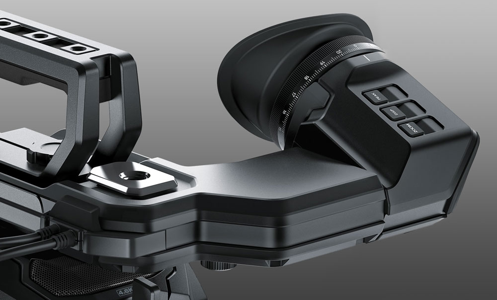 一個意外的驚喜(如果URSA Mini還不能算大驚喜的話)是Blackmagic可選購的OLED電子取景器(EVF)。這是一個很棒的OLED EVF,有全1080物理解析度、真正的玻璃屈光度調節光學器件、及專用的實體按鈕(ZOOM、DISP、PEAK)。這個HD OLED EVF提供了2X縮放、影格框線、格式資訊、兩個CFast 2.0插槽的執行時間、電池電量、斑馬紋、亮度分布色塊(False Color)、峰值對焦、音量表、REC709 LUT等功能,總之很棒。