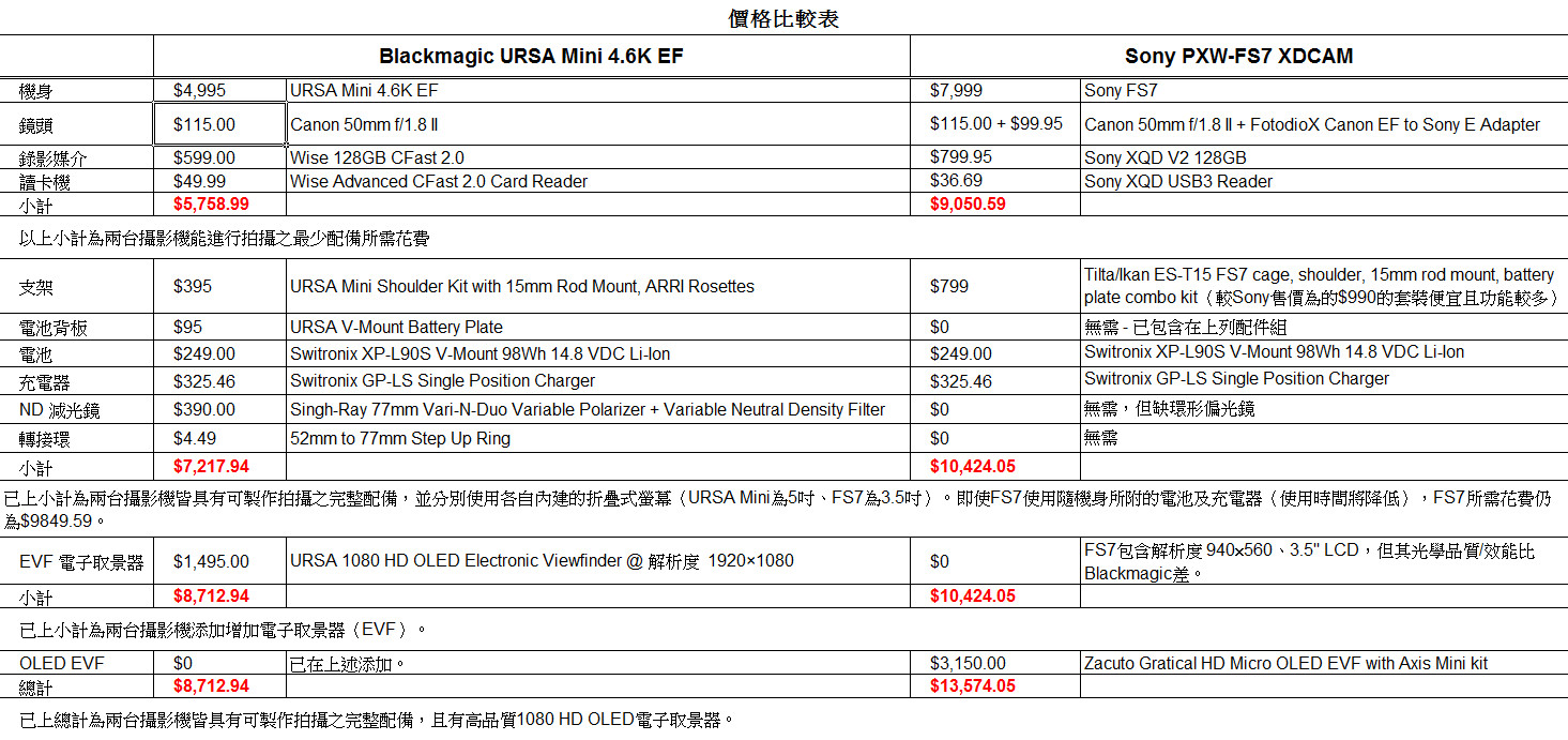 如果你把Sony FS7(7,999美金)、一片Sony XQD V2 128GB卡(799.95美金)和一個Sony XQD USB3讀卡器(36.69)的成本加起來的話,總共是8,835.64美金。而你把URSA Mini 4.6K EF(4,995美金)、一片SanDisk CFast 2.0 128GB卡(499.95美金)和一個Lexar CFast 2.0 USB3讀卡器(37.34)加起來的話,總成本是5,532.29美金。這樣還是比FS7便宜3,303.35美金(而且別忘了,用URSA Mini的話,你還能得到更高的解析度、更寬廣的動態範圍、12 Bit RAW和所有ProRes格式)。就算你再加上上面說的Singh-Ray 77mm Vari-N-Duo(390美金)為URSA Mini做可變ND/偏光控制,那還是比FS7便宜2,913.35美金。加上Blackmagic肩架套件(395美金)和HD OLED EVF(1,495美金),你會得到一台比FS人體工學更好的攝影機,而價格還是比沒有FS7肩架套件或EVF的FS7便宜1,023.35美金!我很驚訝網上還有很多討論說組建一套FS7攝影機拍攝系統的總成本比URSA Mini少或一樣,但事實上,URSA Mini不僅獲取成本低得多,而且還有大量FS7所不具有的內部功能。