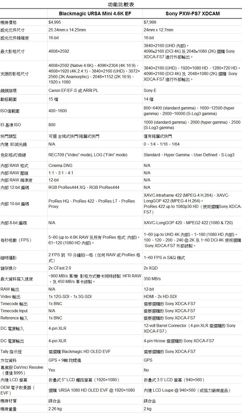 先瞭解了這些之後,讓我們來看看URSA Mini和FS7的基本比較: