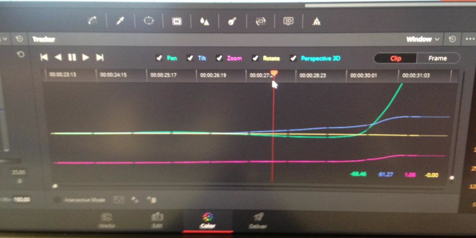 雖然Resolve 11的追蹤功能已經很強,但此新的選項將其提升至另一個層級。就像PTZR控制一樣,你可選擇追蹤對哪一條函數有作用,有時你會用到它、有時並不需要。我發現,當物件特別模糊不清、或跑出畫面時,它非常有用且效果很好。除了3D透視追蹤器(Perspective 3D Tracker)之外,Frame選項對於手動移動物件及Rotoscope,也有很大的改進,我發現它更直覺。