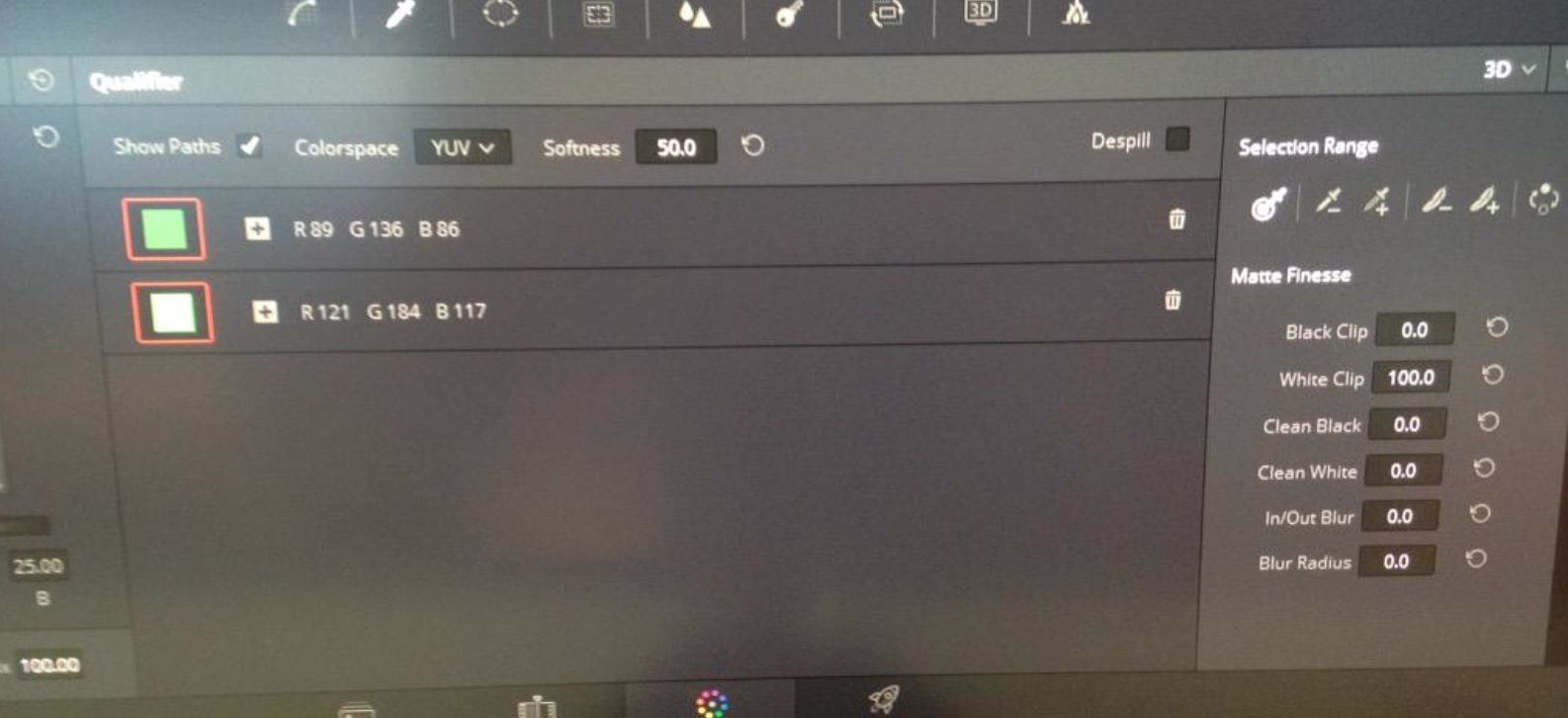 除了原有的HSL、RGB、及Luminance Qualifier之外,Resolve 12現在多了一個新的3D Qualifier。我應該在一開始就先說明,這並不意味著要取代其他任何Qualifier,而是成為另一種增強調光能力的工具。從我所工作的素材來看,我發現它在綠幕及藍幕素材上非常棒,結合其新的Despill功能,它真的很強。此外,還有一些新的清除(Cleanup)功能,對於要完美去背非常有幫助。3D Qualifier對於膚色(Skin Tone)的去背似乎也是其強項,你所選的每一個顏色,提供你該顏色的RGB值,你可以觀看樣塊(Swatch),且如果需從新來過時,你可刪除該圖層(Layer)。我也發現,通常你不會想要做超過三次以上的選取,如果超過了,你的邊緣就會太利(Sharp),如果是這樣,那你可能用別的Qualifier可獲得比較好的去背結果。