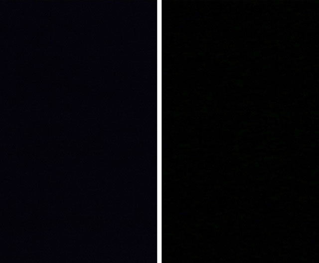 因此,我決定做一個極端的測試:我用Canon 70D拍一張純黑的影像。我不在攝影機上裝鏡頭,就只是蓋上鏡頭蓋,然後拍一張照。我將攝影機設定成RAW+JPEG,這樣我可以直接從攝影機得到兩種格式的影像。攝影機的設定為1/60s、ISO 3200,乍看之下,它們看起來完全相同且都是純黑: