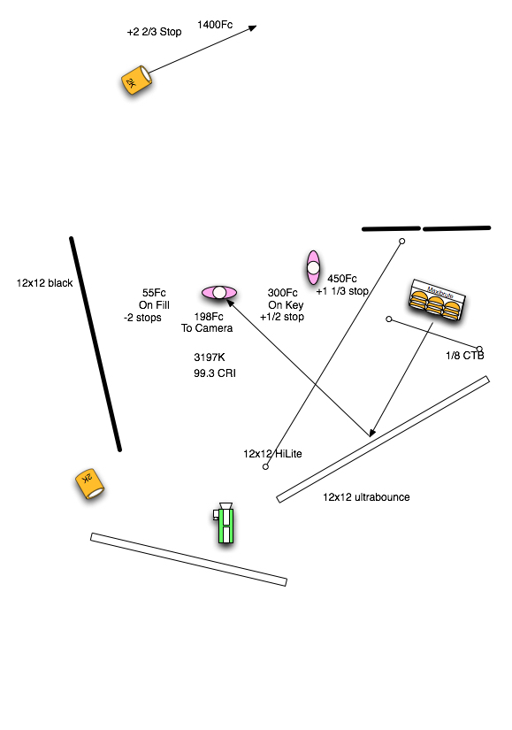 我設計這樣的場景以顯示一些對比,我也在背牆上添加了亮度漸層(Brightness Ramp),你從這裡的Fc(Foot Candle 呎燭光)讀數,可以瞭解檔位(Stops)超過或不足幾檔。