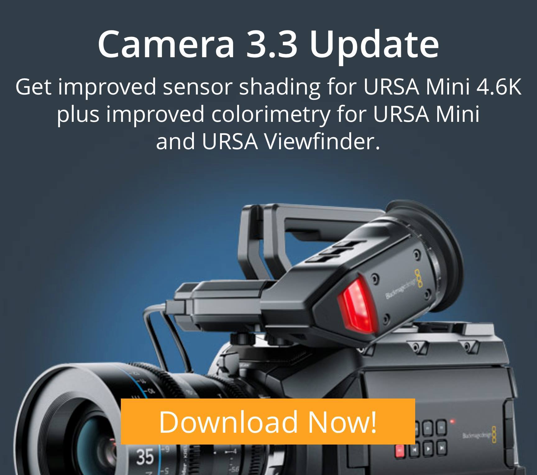 新版的3.3韌體更新,對於URSA Mini 4.6K改進了白平衡(White Balance)及感光元件對於Lens Shading的反應。除此之外,改進了當以Video動態範圍(Dynamic Range)進行拍攝時的飽和度(Saturation),也改進了所有Blackmagic URSA Mini機型和Blackmagic URSA Viewfinder的Film to Video監看。